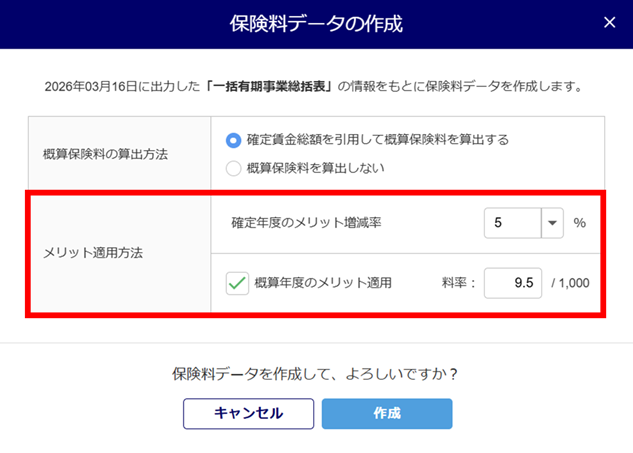 上図の「保険料データの作成」画面は、組機様式第8号以外で「一括有期事業総括表」を作成している場合に、概算年度のメリット適用のみ設定できます。