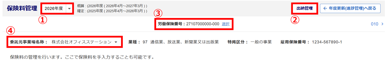 出納管理 「①対象年度」「③労働保険番号」で選択した年度、労働保険番号の「出納管理」画面に移動します。