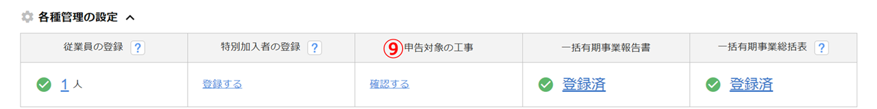 一括有期事業総括表 「一括有期事業統括表」の出力状況が表示されます。 出力済みの場合、[登録済]、未出力の場合、[未登録]と表示されます。