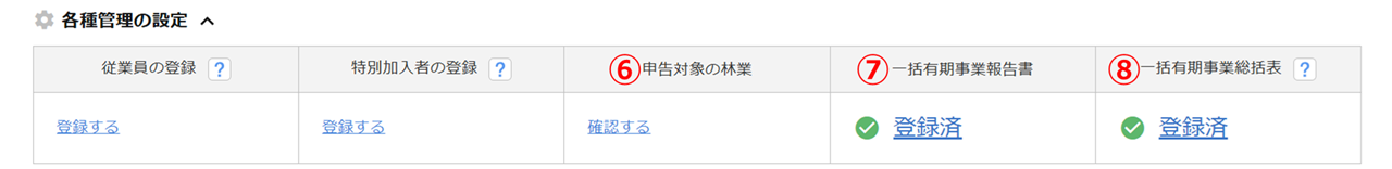 申告対象の林業 年度更新の対象期間内の林業情報の件数が表示されます。登録されていない場合、[確認する]と表示されます。