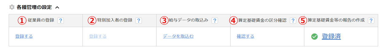 算定基礎賃金の区分確認 委託元事業場に登録している従業員のうち、算定基礎賃金の区分(常用労働者、役員で労働者扱いの者、臨時労働者)の設定が1ヶ月でも完了している方の数が表示されます。