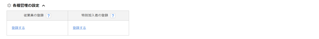 特別加入者の登録 労働保険番号に属する特別加入者の数が表示されます。ただし、加入期間外の方も数に含まれています。登録していない場合[登録する]と表示されます。