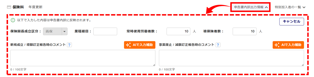 [申告書内訳出力情報]をクリックすると、申告書の内訳に記載する情報を設定する欄が表示されます。