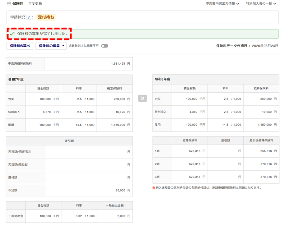 「保険料管理」画面に、「保険料の算出が完了しました。」と表示されます。算出した保険料をご確認ください。