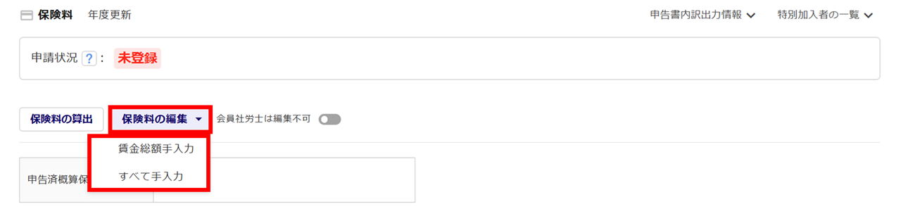 [保険料の編集]をクリックし、表示されるメニュー内の[賃金総額手入力]または[すべて手入力]をクリックします。