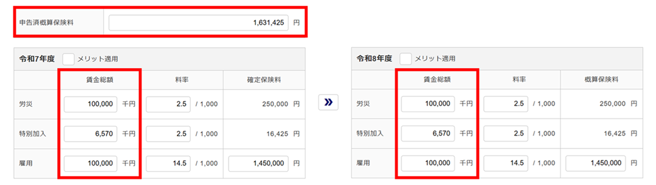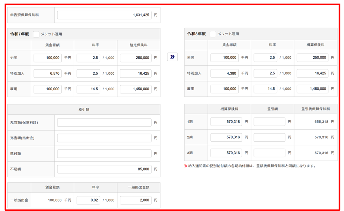 ※確定年度のメリット適用状況・料率は、一括有期事業総括表より自動取得します。