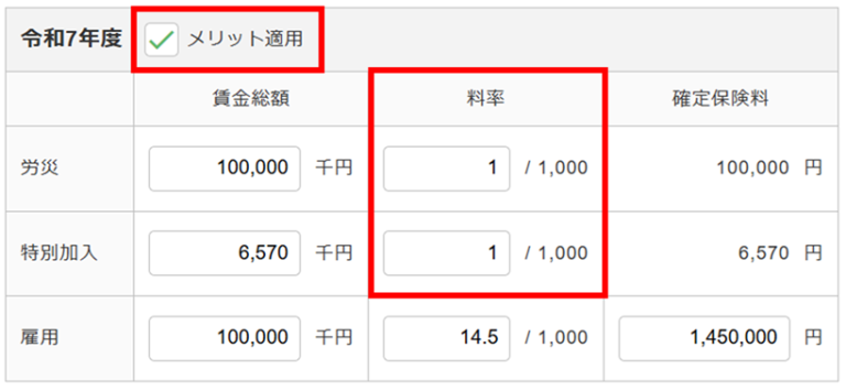 メリット適用方法 メリット料率を適用する場合は、チェックし、料率を入力します。
