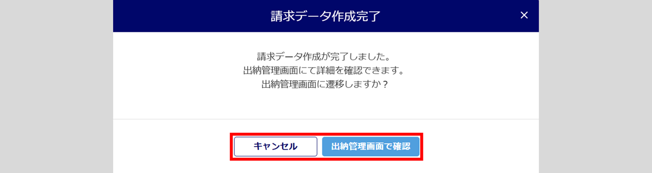 「出納管理」画面に移動し請求データを確認する場合は、[出納管理画面で確認]をクリックします。