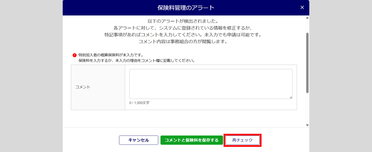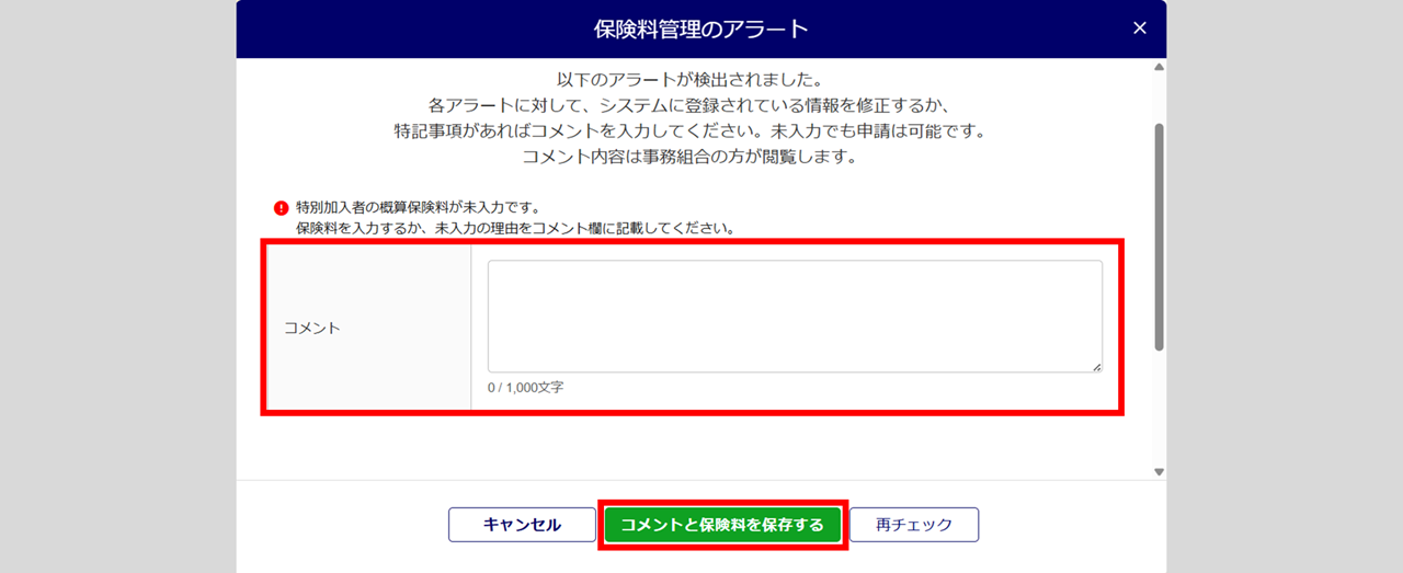 コメントを入力せずに、[コメントと保険料を保存する]をクリックすると、「未回答アラート確認」画面が表示されます。