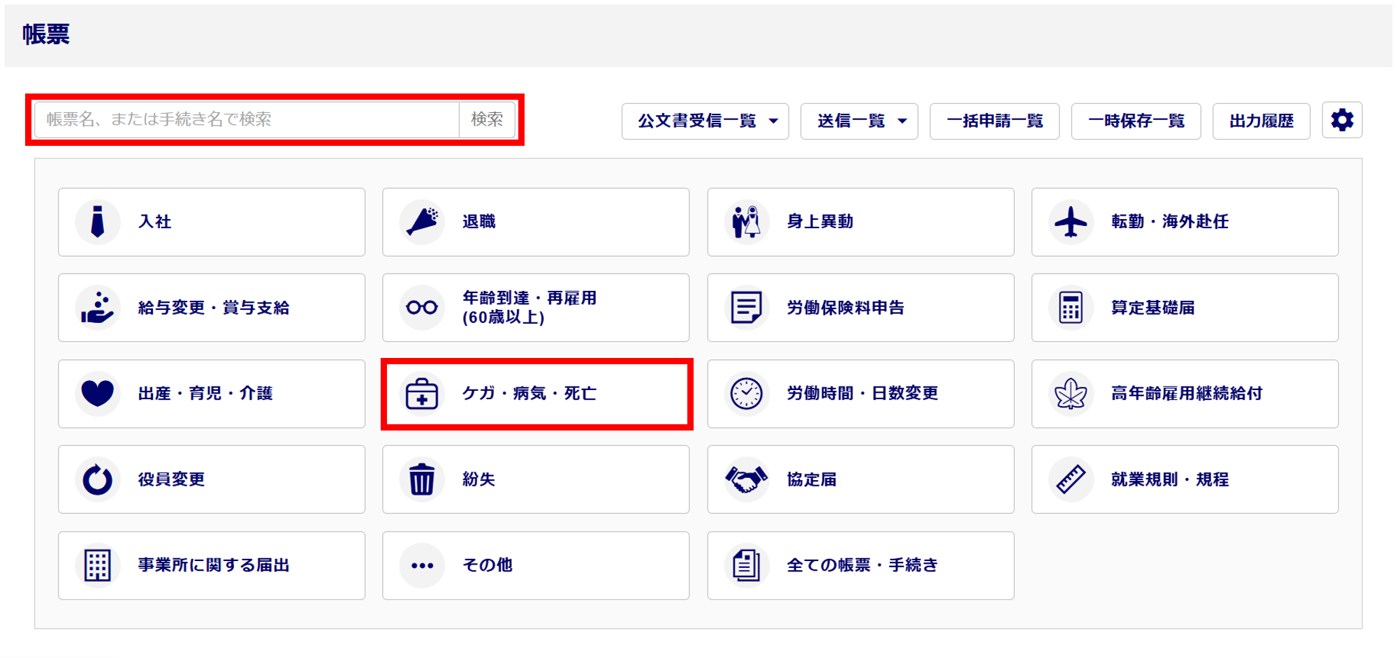 検索窓に帳票名または帳票名の一部を入力し[検索]をクリックします。