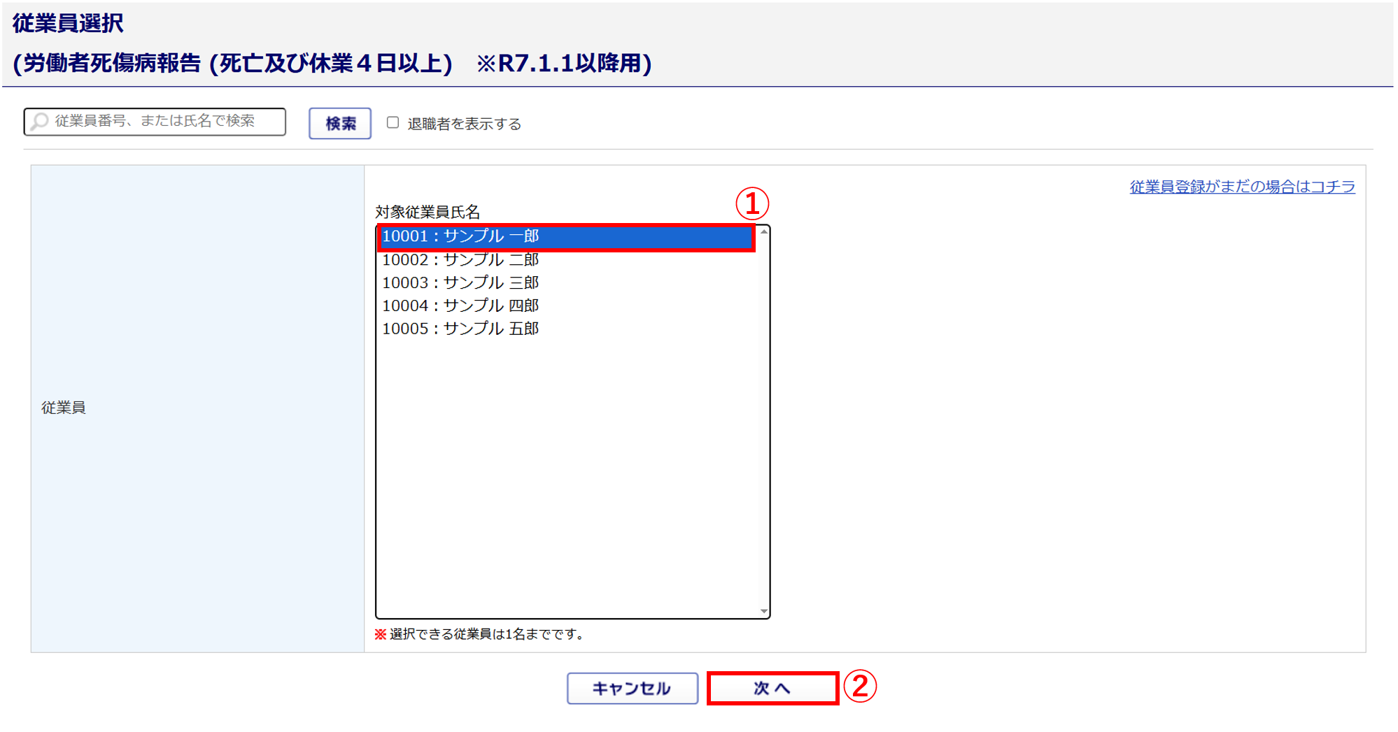 「対象従業員氏名」(①)を選択し、[次へ](➁)をクリックします。