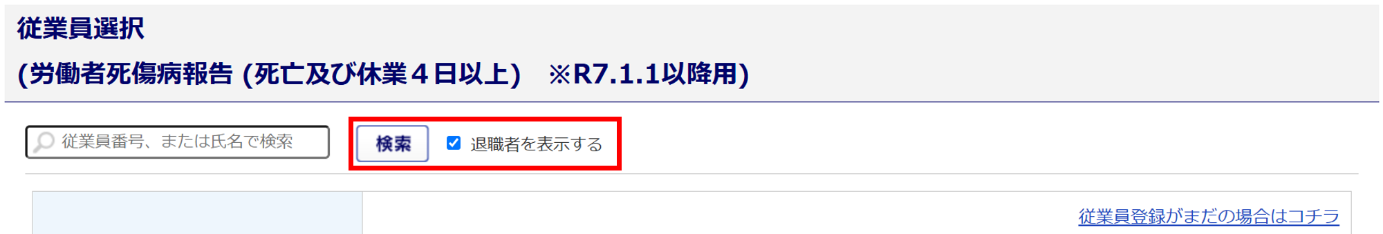 「退職者を表示する」にチェック、[検索]をクリックすると退職者が表示されます。
