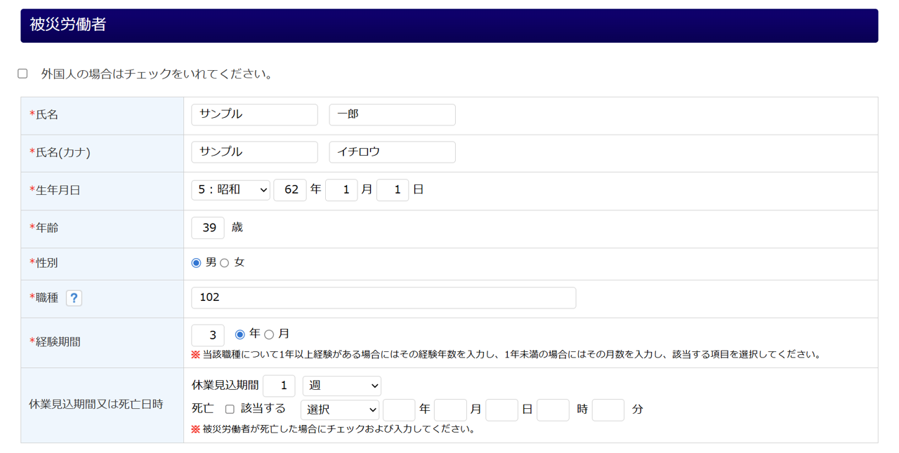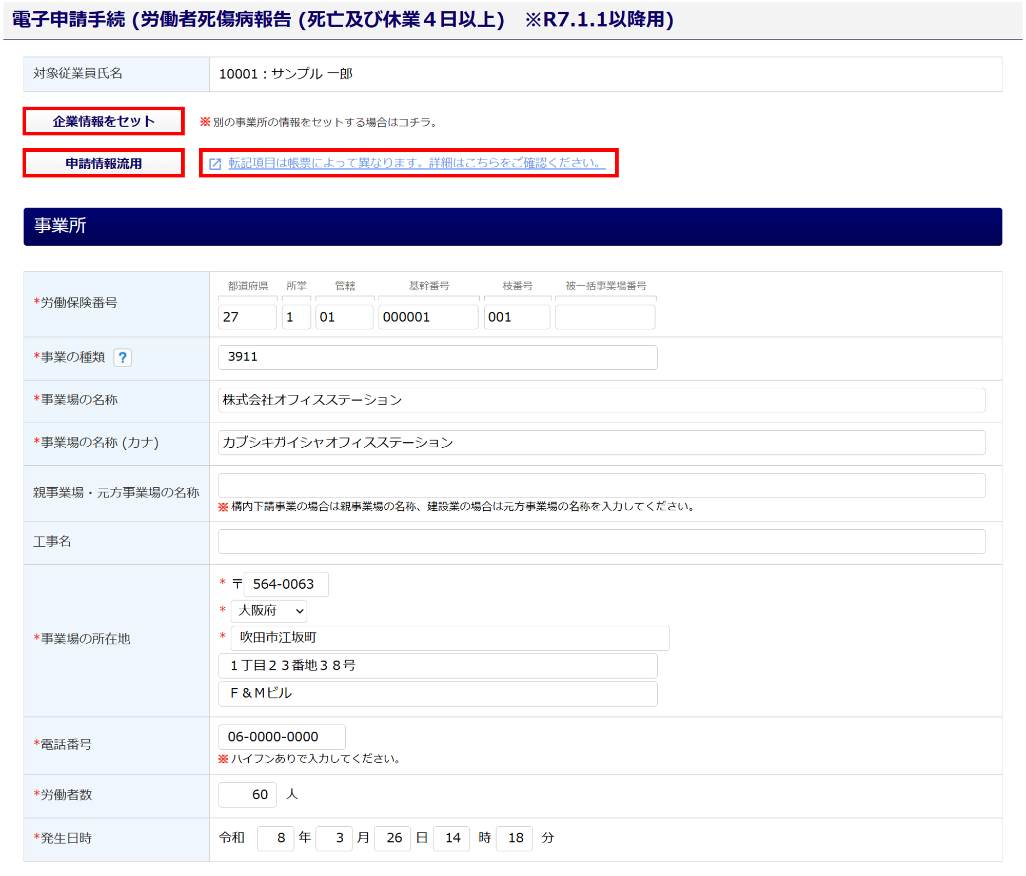 [申請情報流用]をおこなっている場合は、労災保険給付関係請求書の申請情報がセットされています。
