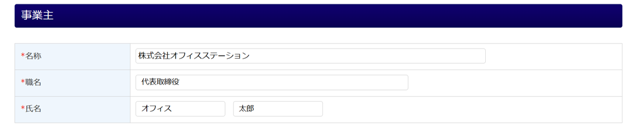 事業主の情報は、「企業設定」(「士業用顧問先管理」)の情報を引用しています。
