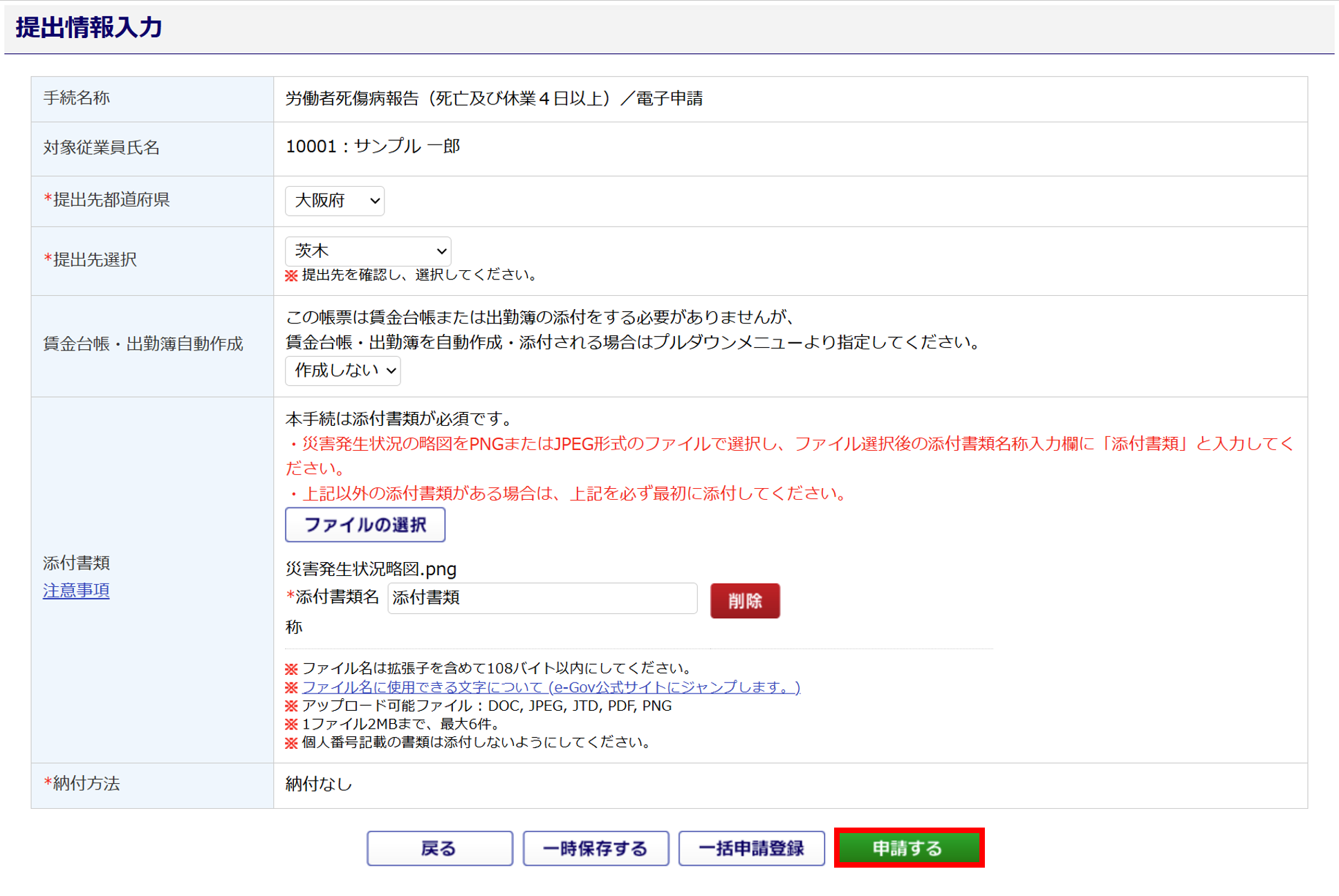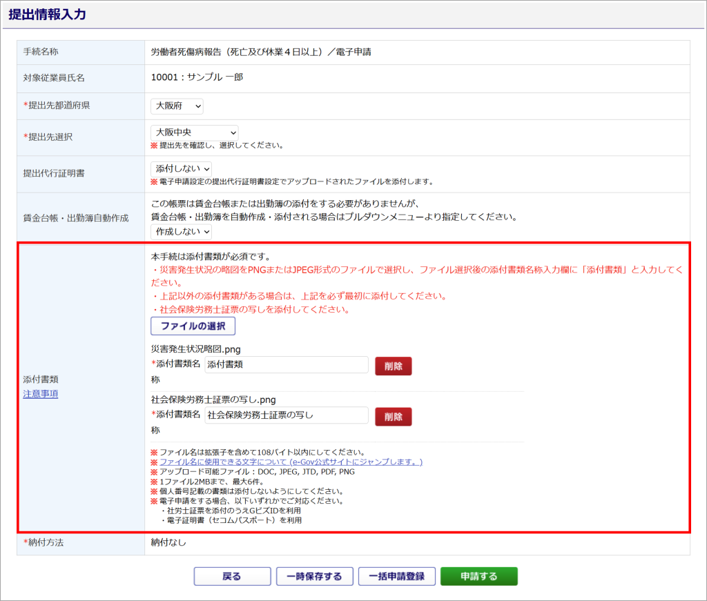 [ファイルの選択]から対象ファイルを添付すると、添付書類名称が「添付書類」へ自動変換されます。