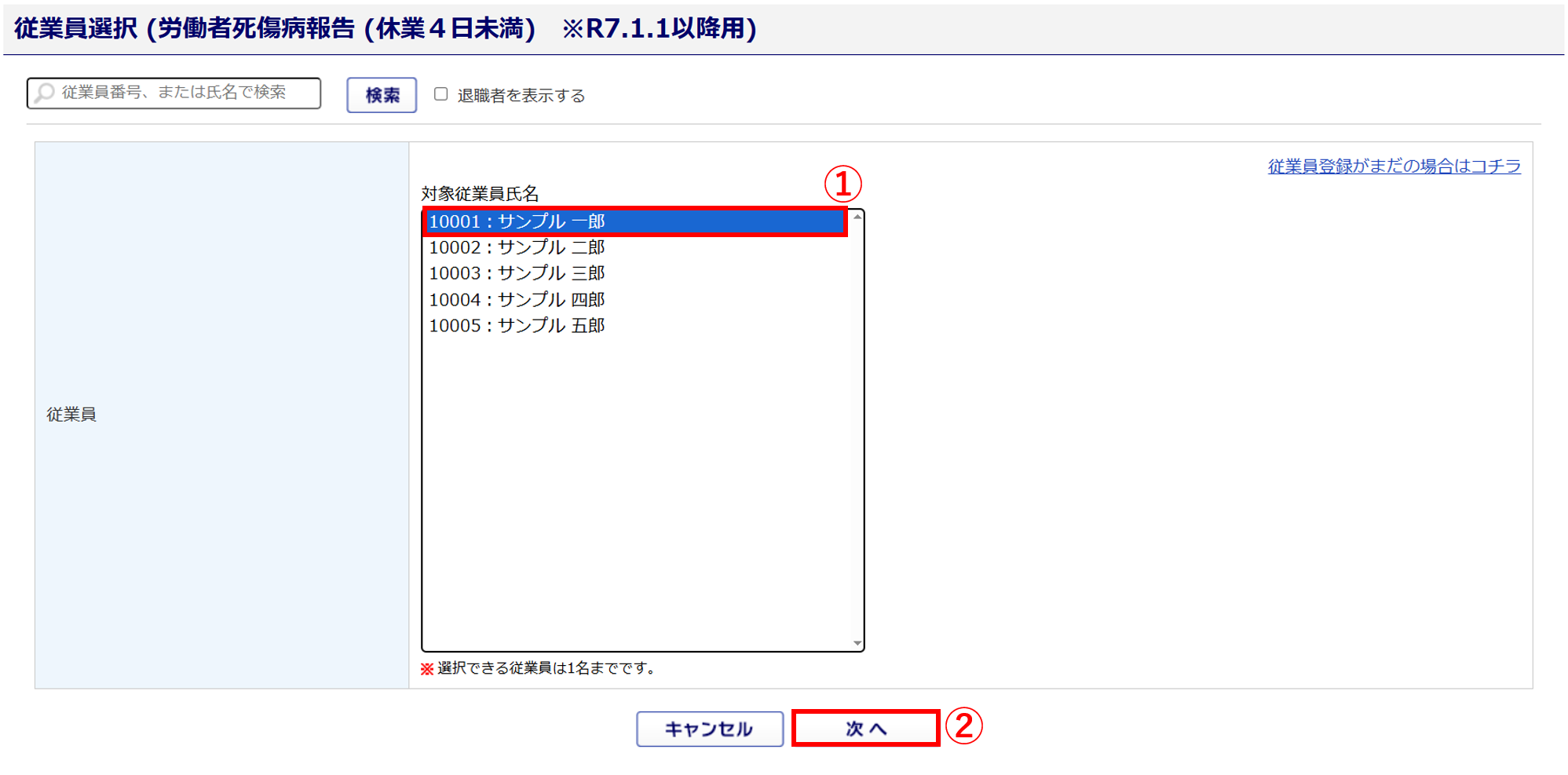 「対象従業員氏名」(①)を選択し、[次へ](➁)をクリックします。