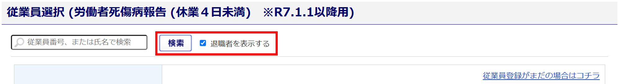 「退職者を表示する」にチェック、[検索]をクリックすると退職者が表示されます。
