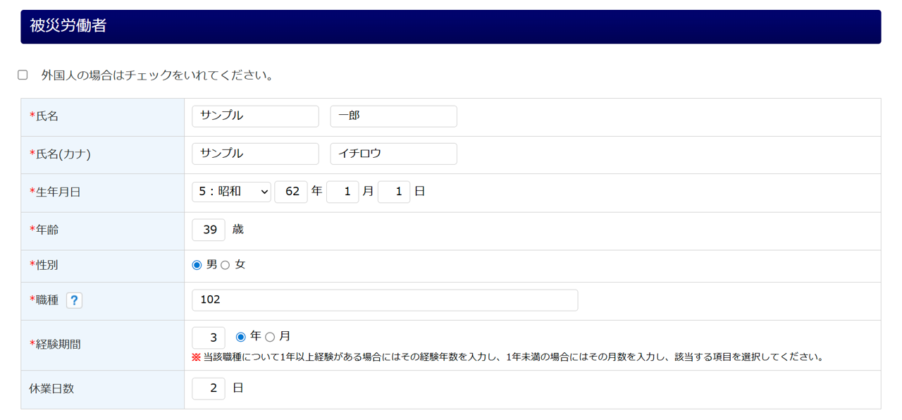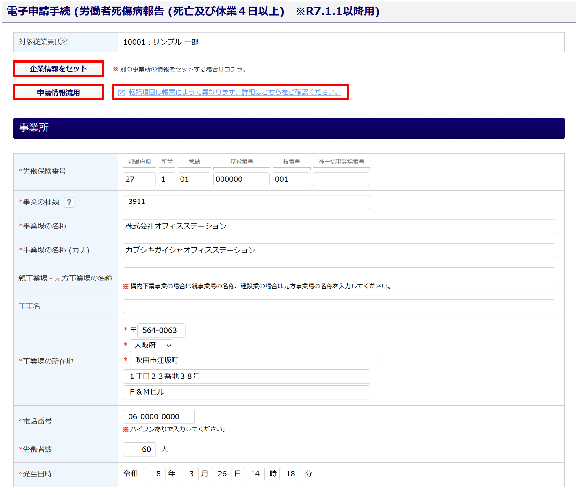 [申請情報流用]をおこなっている場合は、労災保険給付関係請求書の申請情報がセットされています。