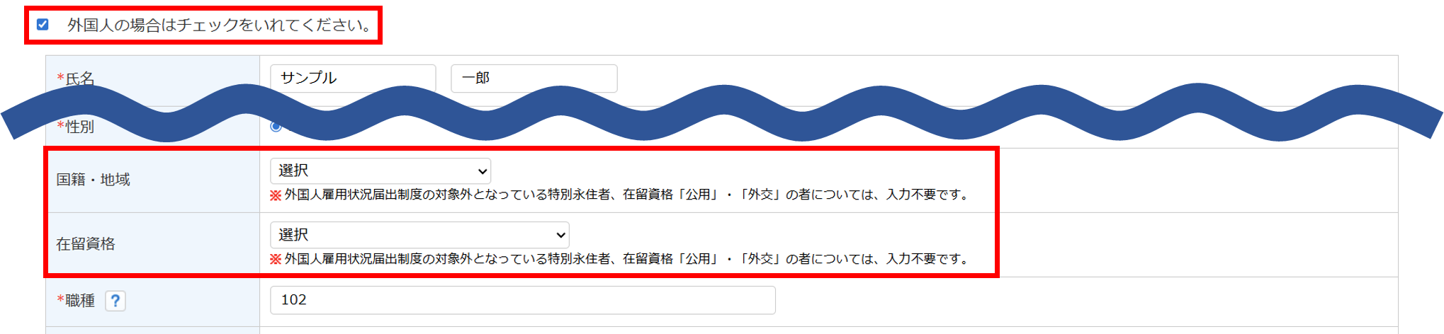 「外国人の場合はチェックをいれてください。」にチェックを入れると、「国籍・地域」、「在留資格」項目が表示されます。