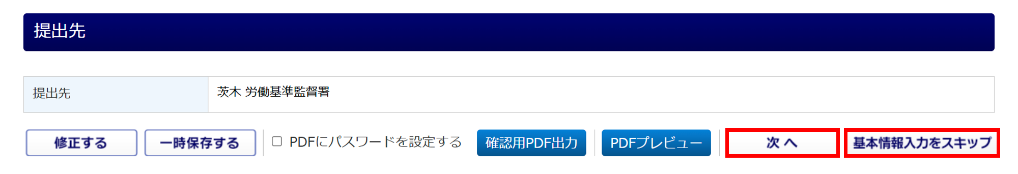 「電子申請手続確認」画面で、[基本情報入力をスキップ]をクリックした場合は、「提出情報入力」へお進みください。