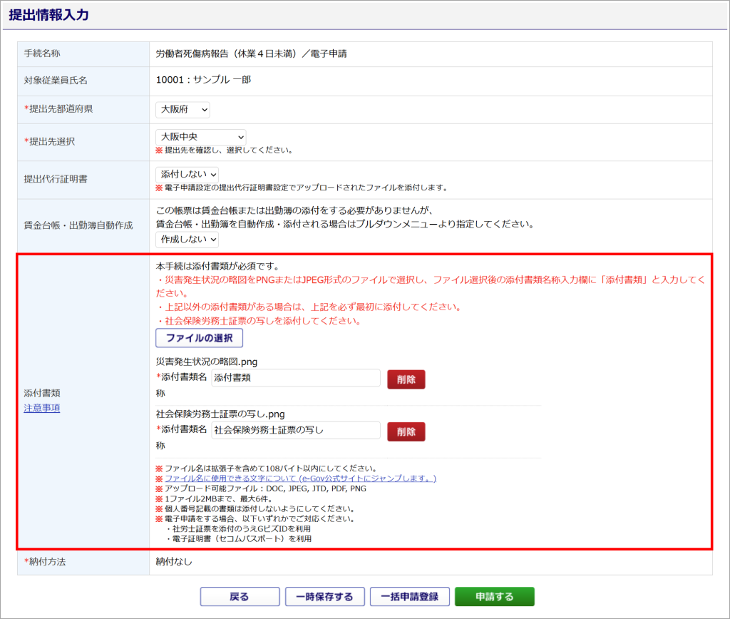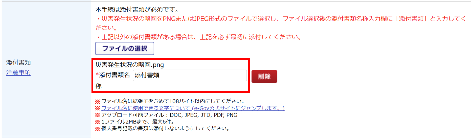 [ファイルの選択]から対象ファイルを添付すると、添付書類名称が「添付書類」へ自動変換されます。