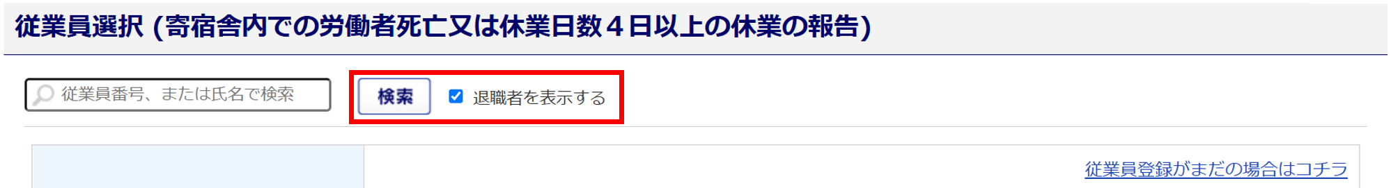 「退職者を表示する」にチェック、[検索]をクリックすると退職者が表示されます。