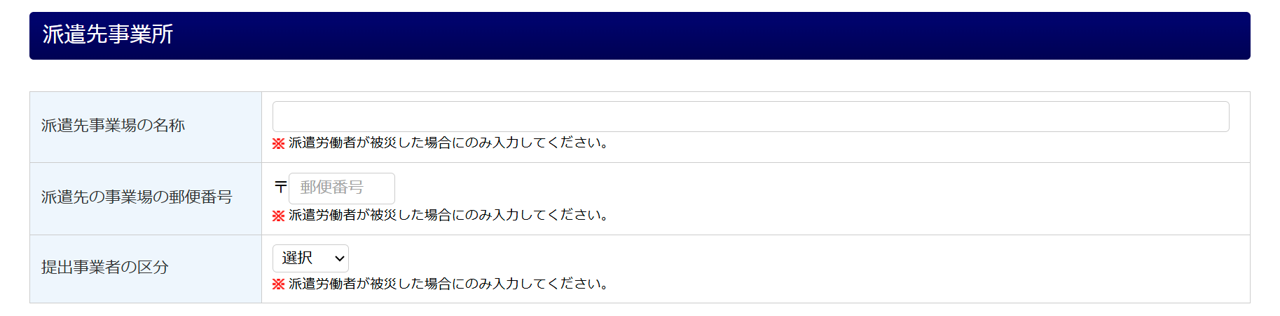 派遣労働者が被災した場合に、派遣先事業所を入力します。