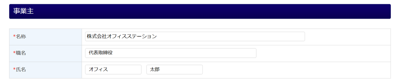 事業主の情報は、「企業設定」(「士業用顧問先管理」)の情報を引用しています。