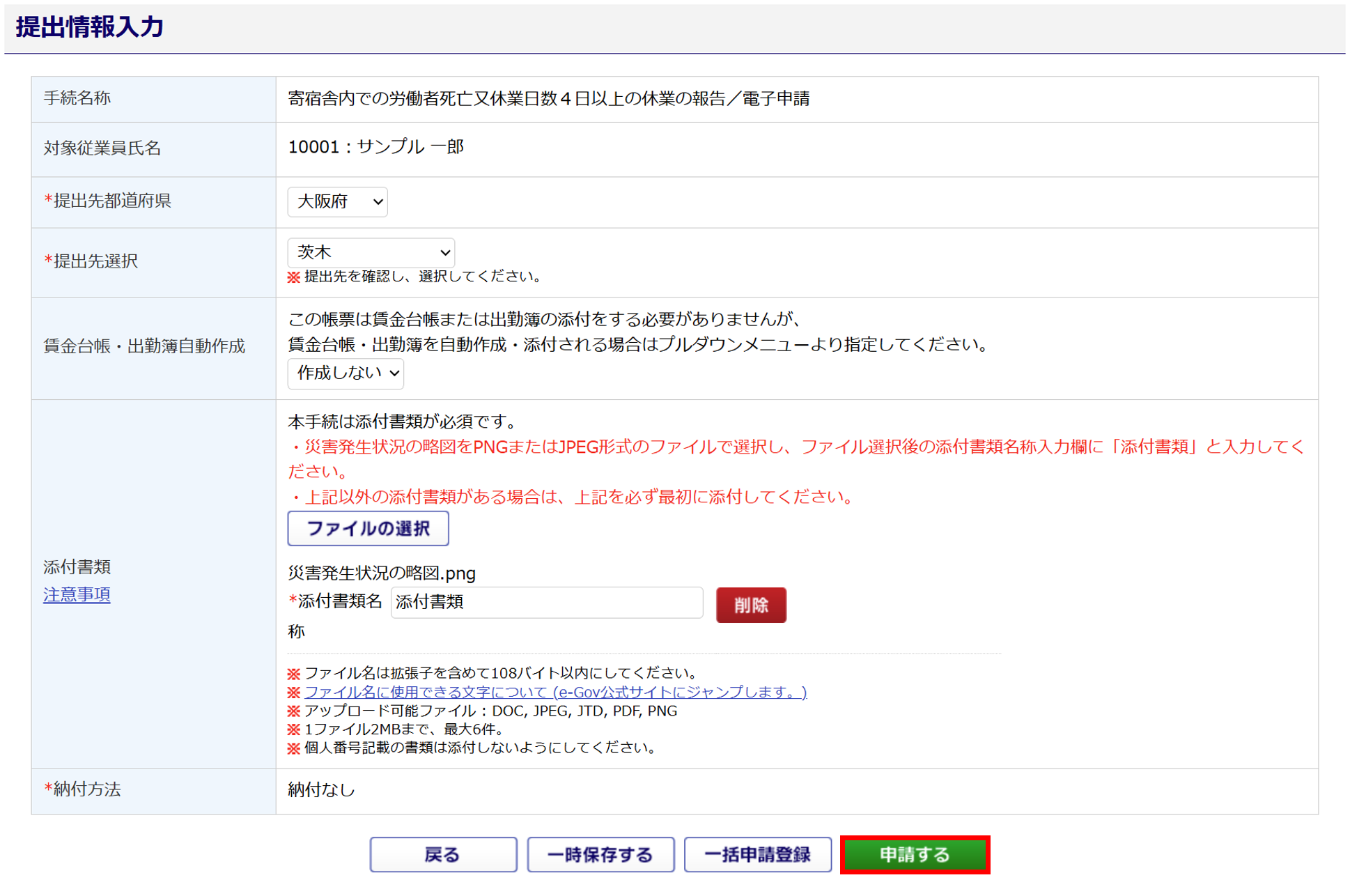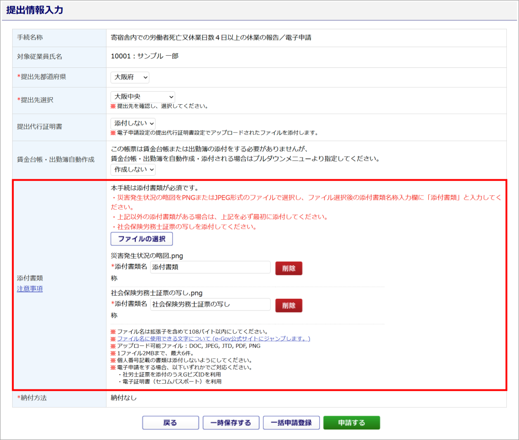 [ファイルの選択]から対象ファイルを添付すると、添付書類名称が「添付書類」へ自動変換されます。