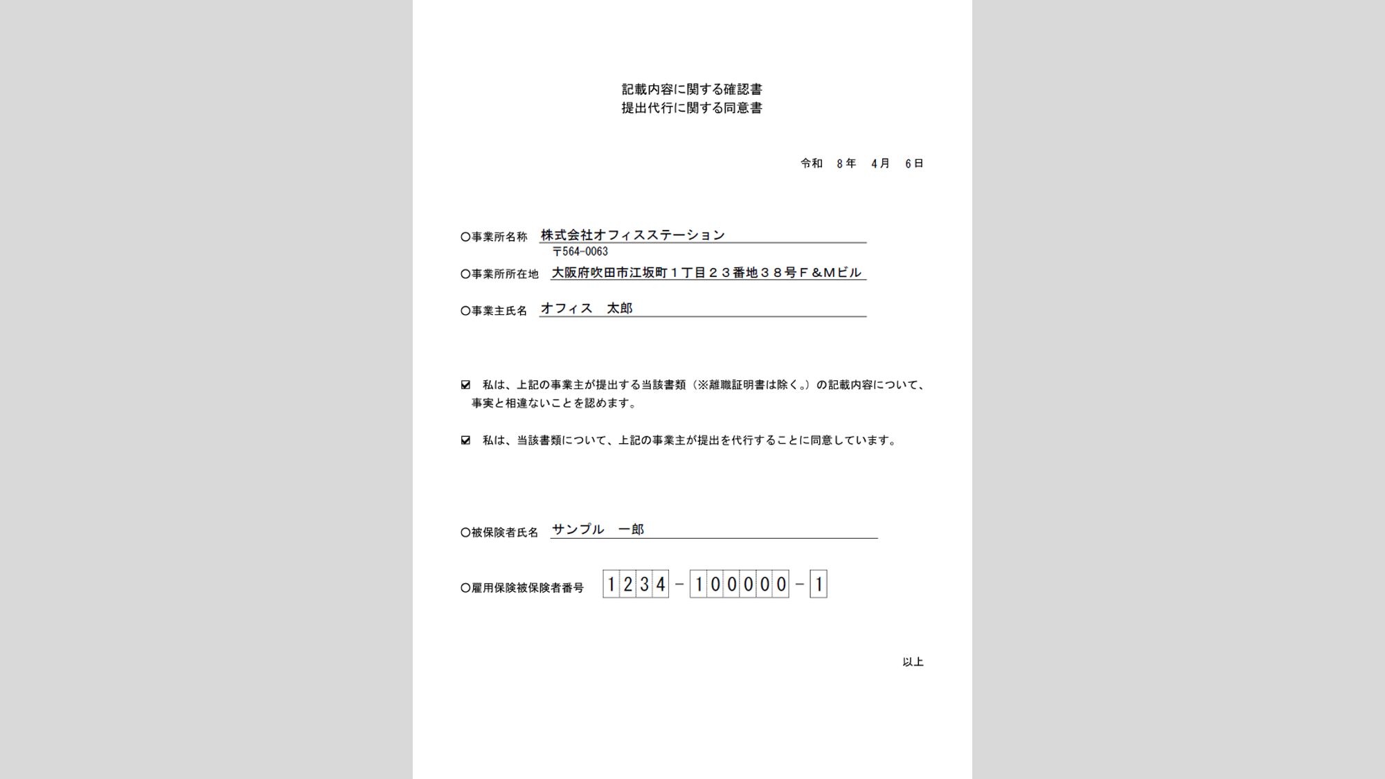 以上で、「記載内容に関する確認書・提出代行に関する同意書」の作成は完了です。