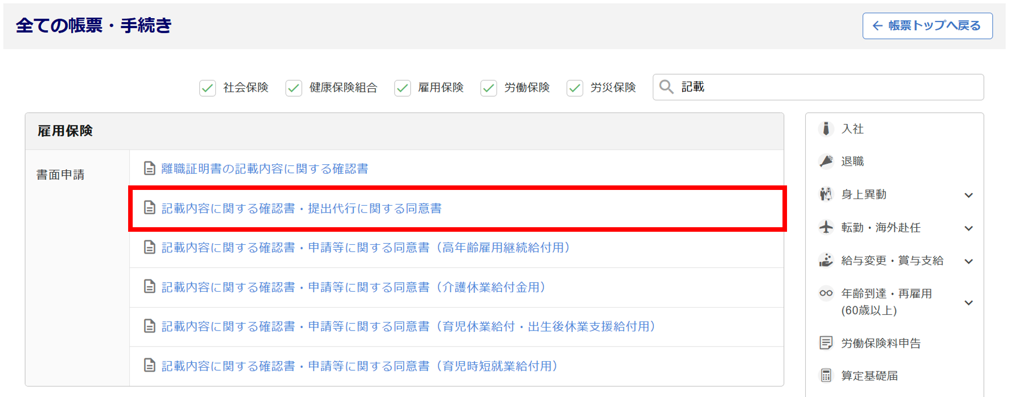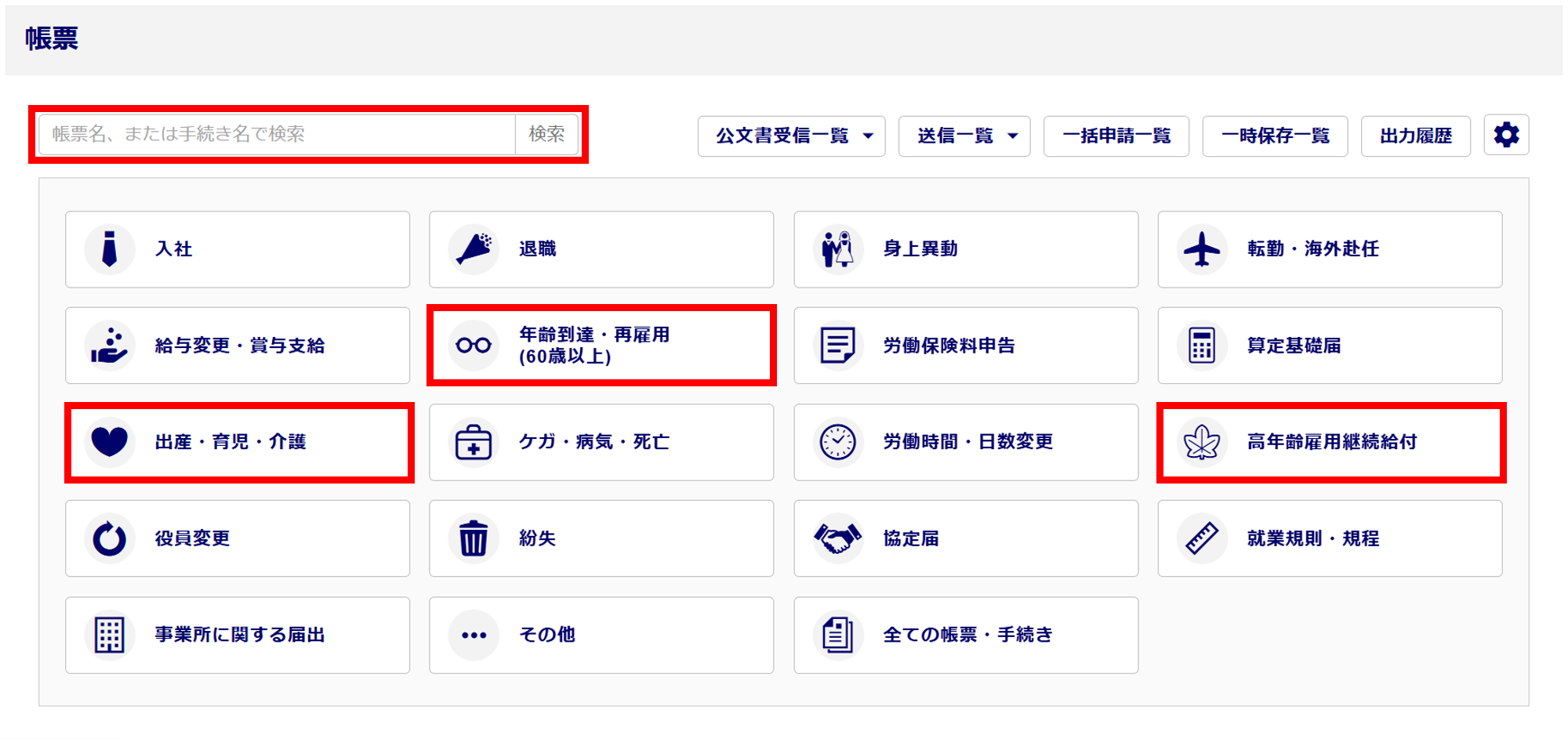または、[年齢到達・再雇用(60歳以上)][出産・育児・介護][高年齢雇用継続給付]のいずれかをクリックします。