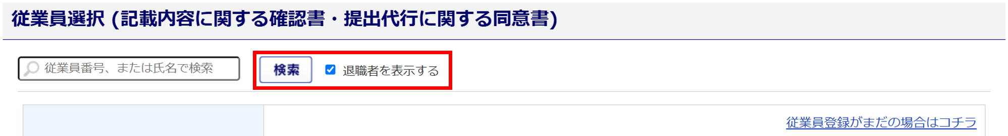 「退職者を表示する」にチェック、[検索]をクリックすると退職者が表示されます。