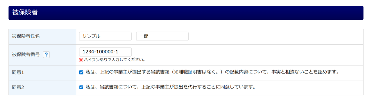 被保険者の情報を入力し、「同意1」と「同意2」にチェックします。