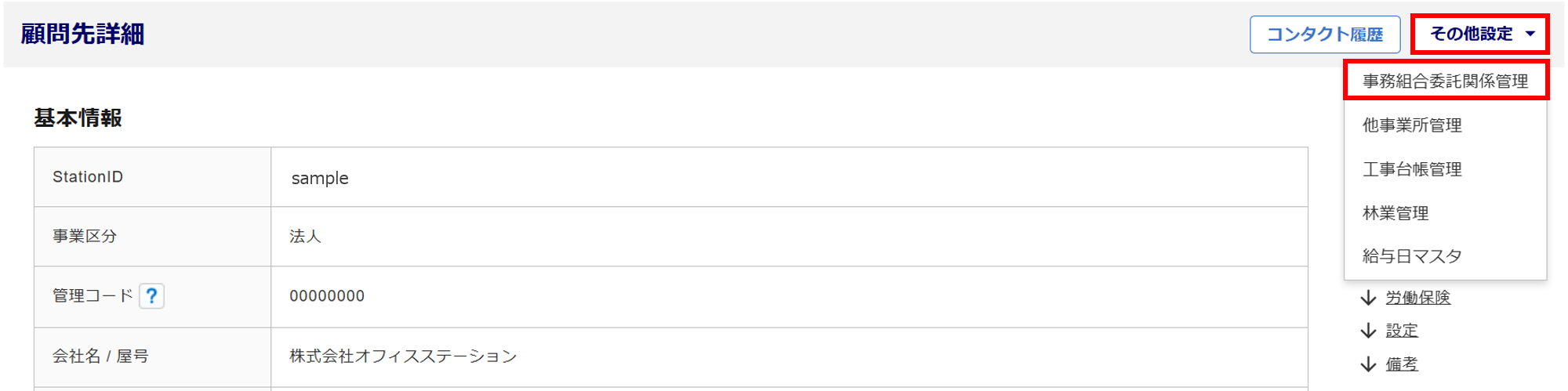 「顧問先詳細」画面にて、[その他設定]>[事務組合委託関係管理]をクリックします。