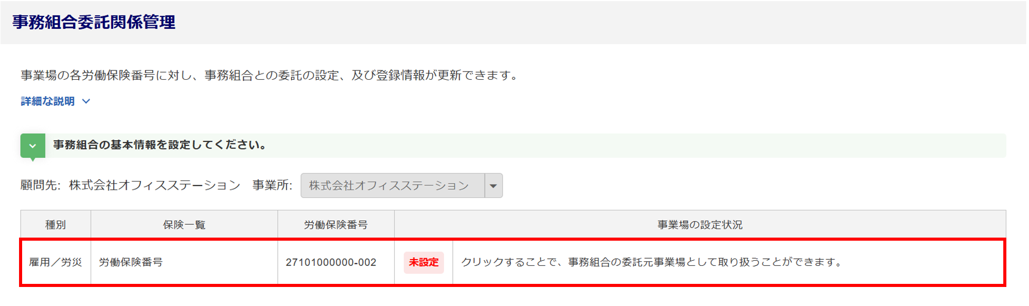 事務組合の委託元事業場として設定する「労働保険番号」をクリックします。