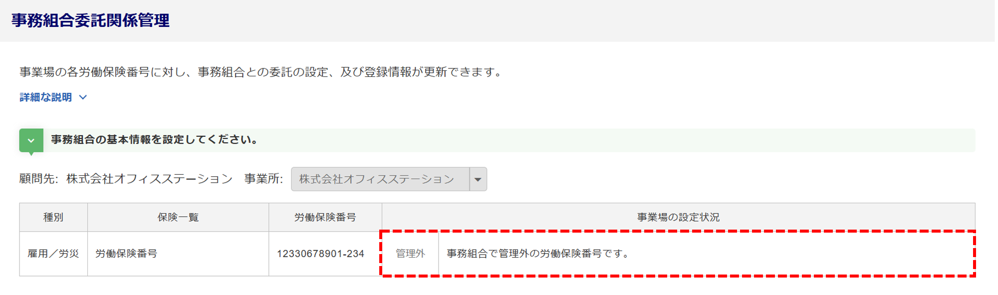 「管理外:事務組合で管理外の労働保険番号です。」と表示されている場合、先に「基幹番号」の登録が必要です。