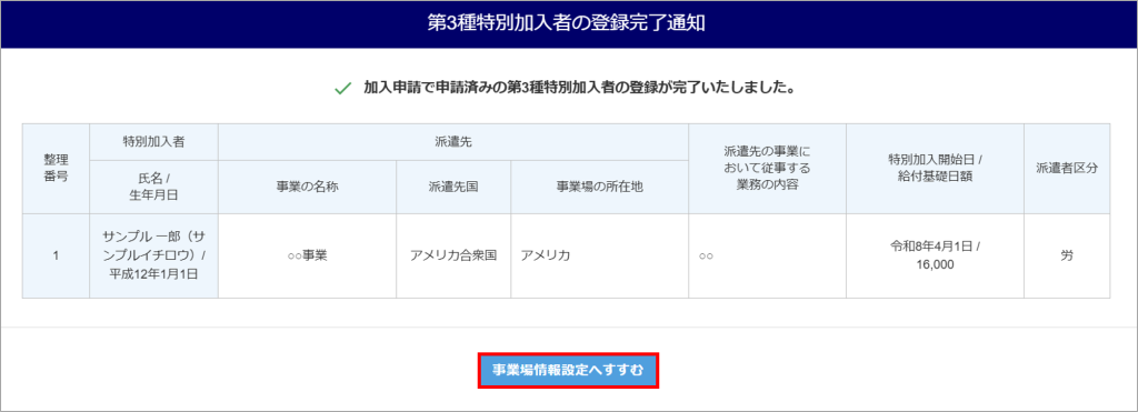 「第3種特別加入者の登録完了通知」画面が表示されます。