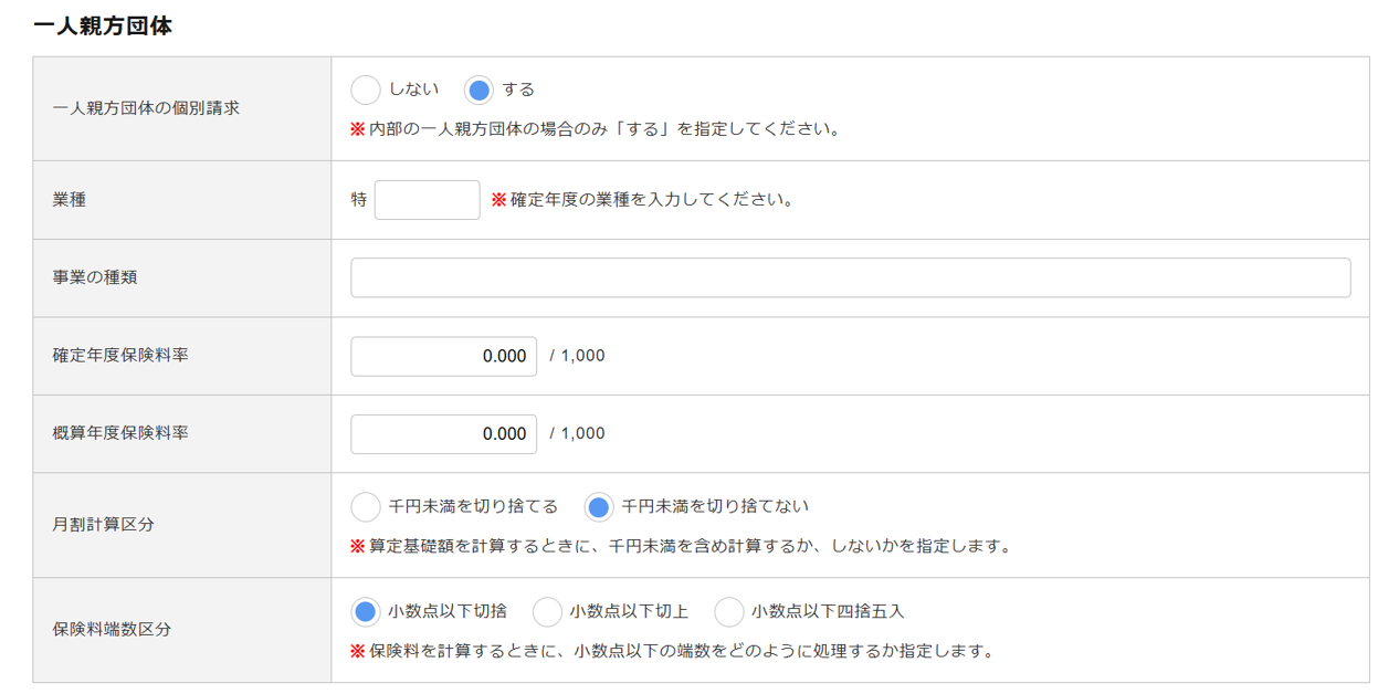 「一人親方団体の個別請求」に「する」を選択すると、「月割計算区分」「保険料端数区分」項目が表示されます。