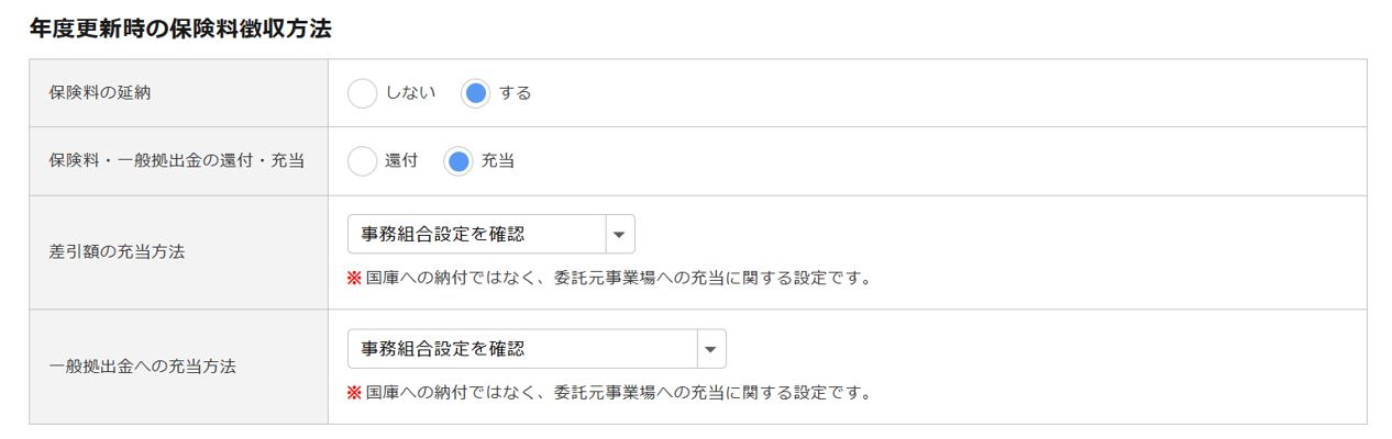 | 差引額の充当方法 | 「事務組合設定を確認」「1期、2期、3期の順に充当」「1期、2期、3期に均等に充当」から選択します。 ※「保険料の延納」に「しない」、または「保険料・一般拠出金の還付・充当」に「還付」を選択時は、「事務組合設定を確認」を固定で設定します。 |