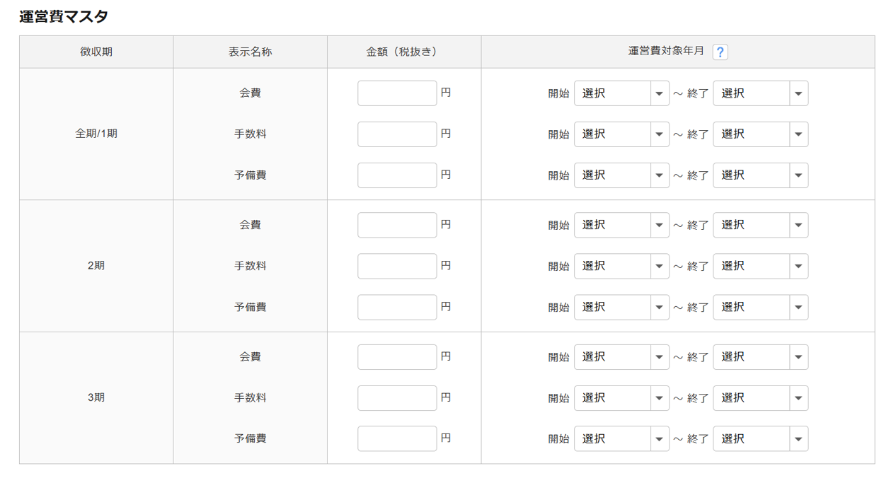 徴収期ごとに、「会費」「手数料」「予備費」の金額と運営費対象年月を登録できます。