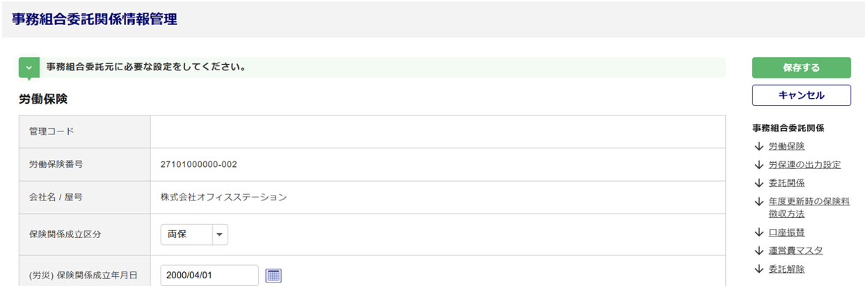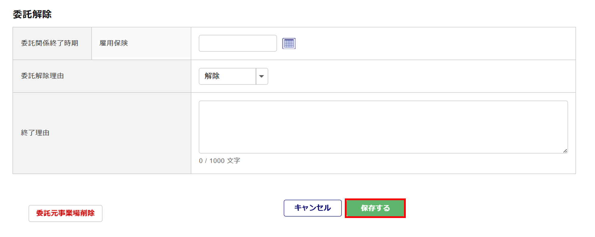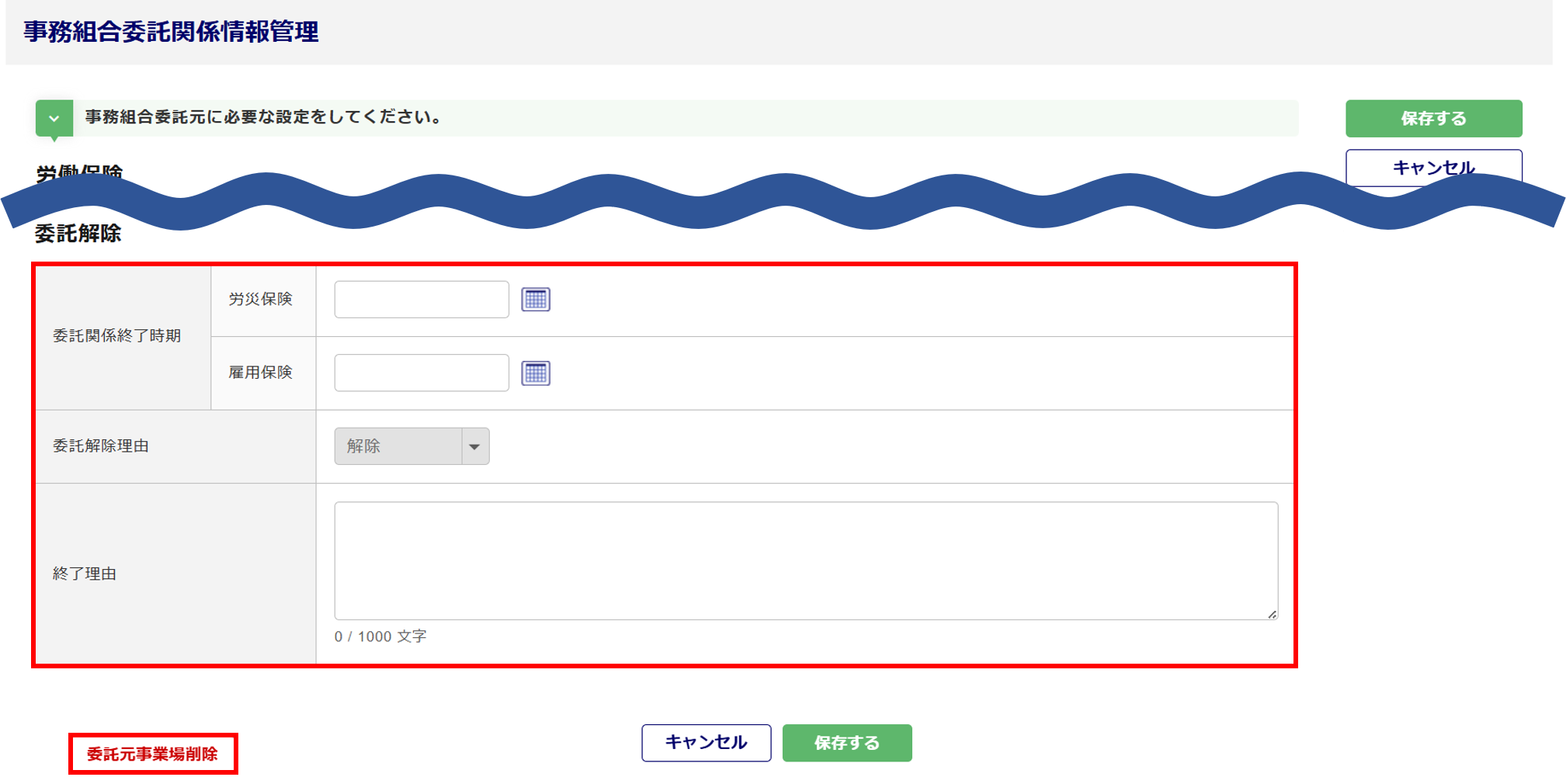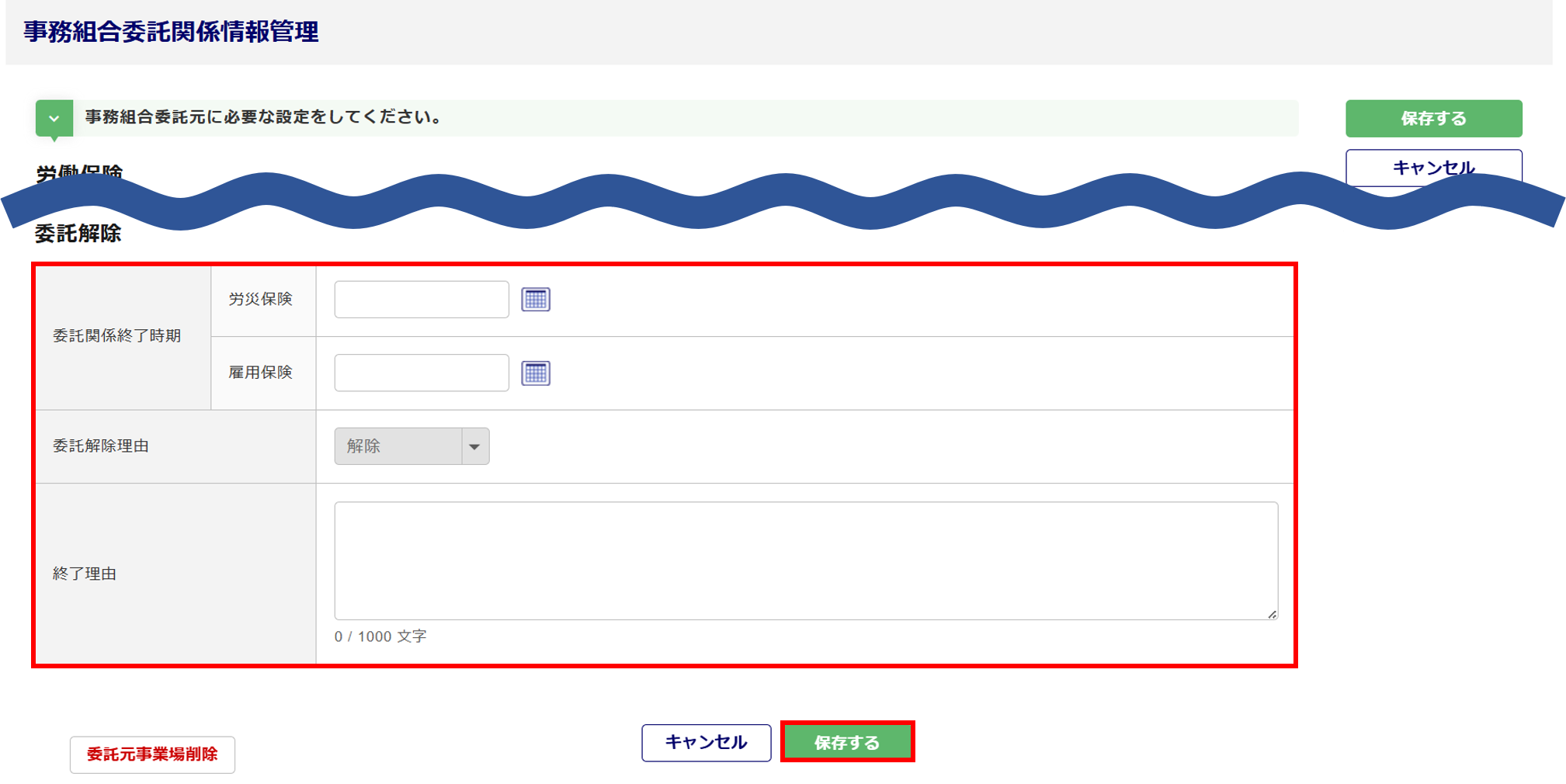 委託解除に関する情報を設定し、[保存する]をクリックします。