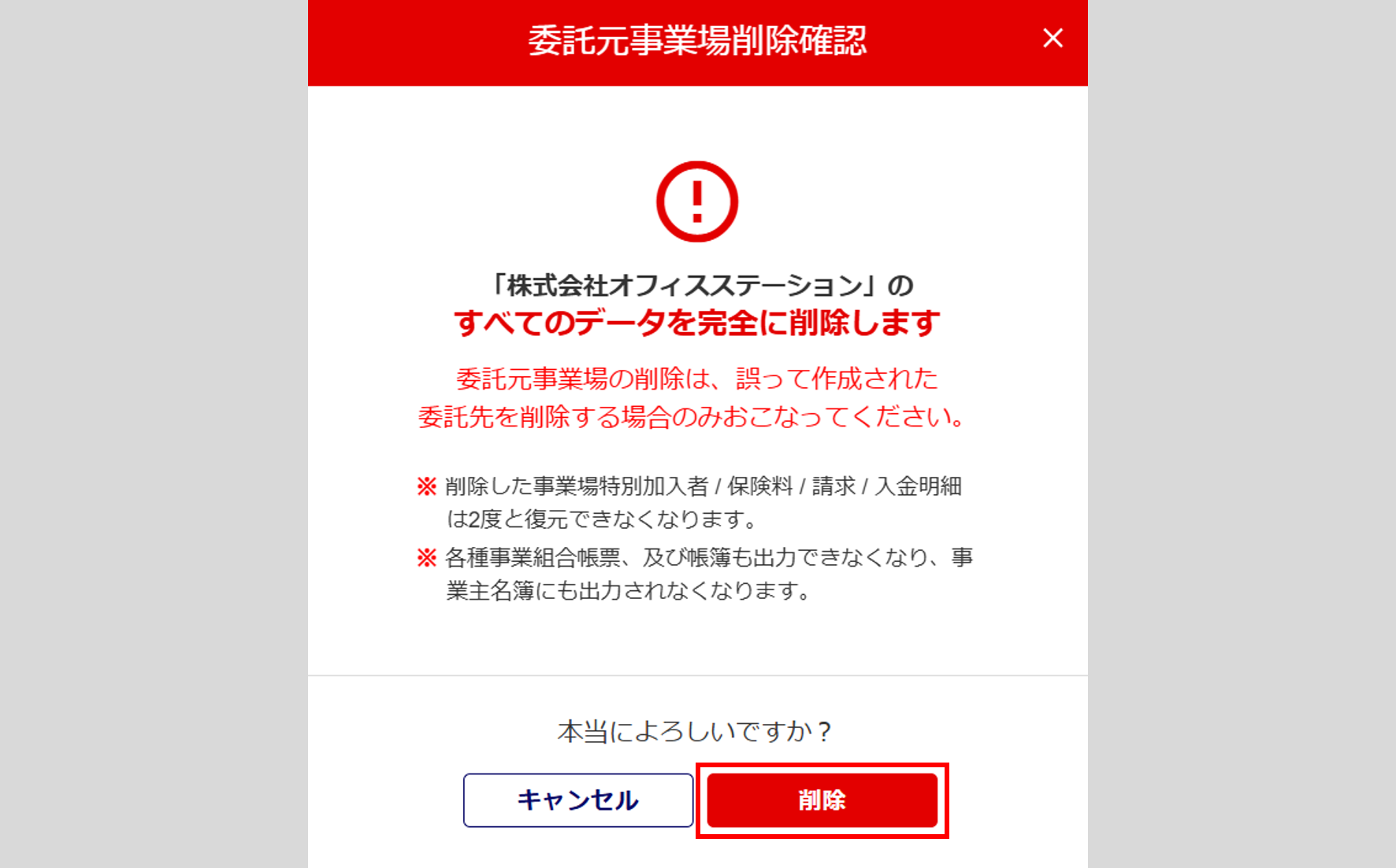 委託設定削除をおこなうと、保険料、請求情報、入金情報、特別加入者などのデータも削除されます。