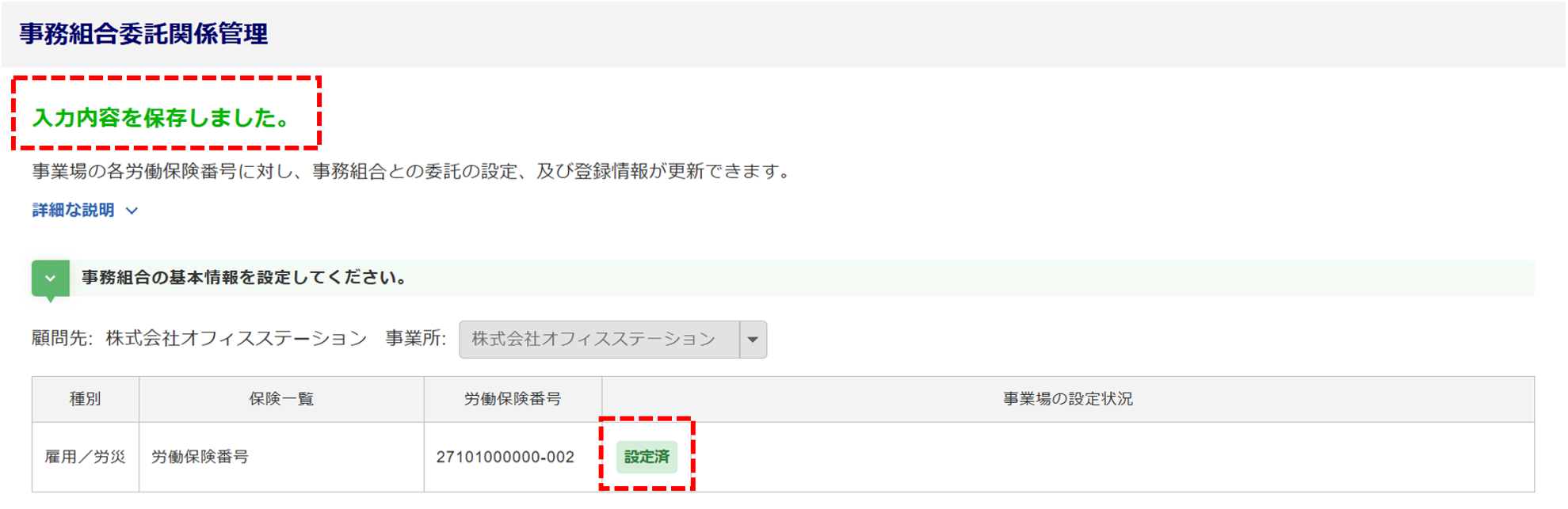 「入力内容を保存しました。」「設定済」と表示されたら、事務組合の委託設定操作は完了です。