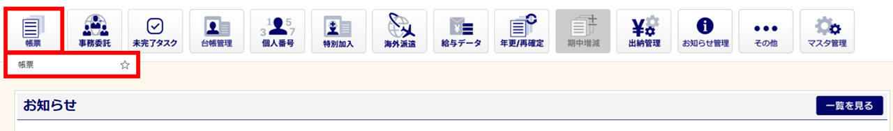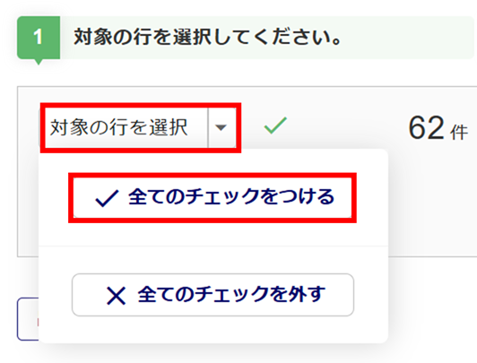 [対象の行を選択]>[全てのチェックをつける]をクリックすると、画面に表示されている帳票すべてにチェックがつきます。