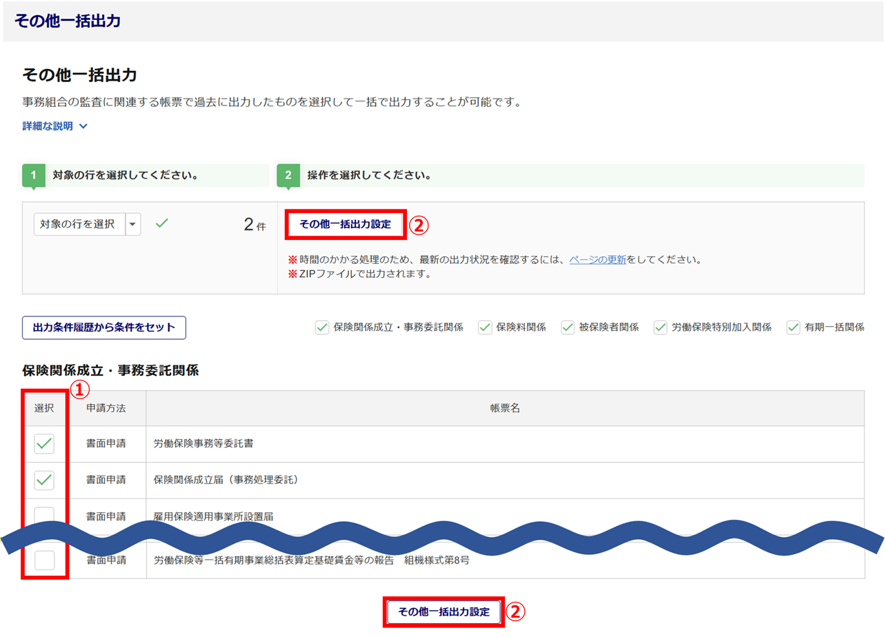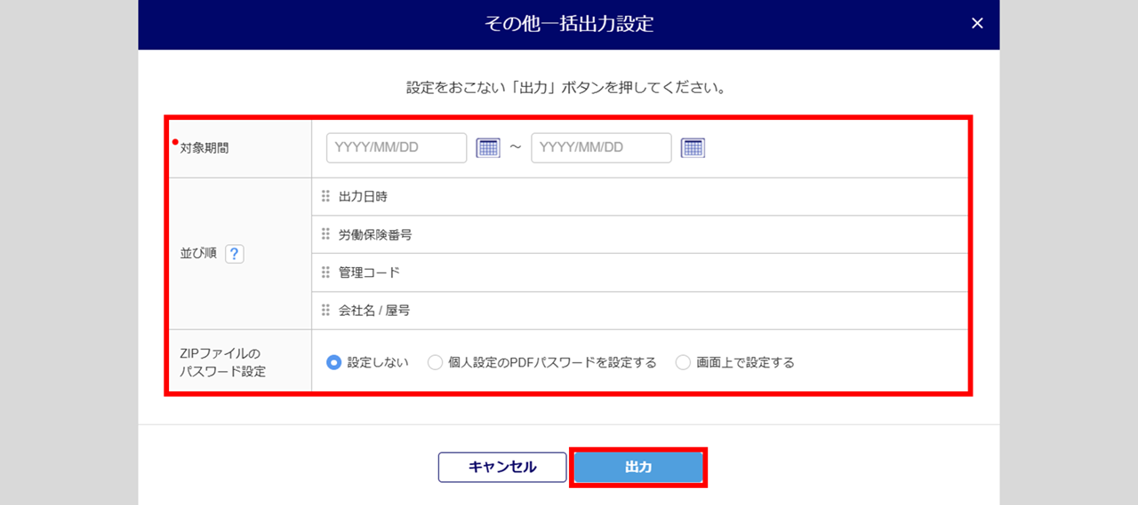 適用する条件の[選択]をクリックすると、その出力条件(選択した帳票、並び順、ZIPファイルのパスワード設定)が反映された状態で、「その他一括出力」画面に戻ります。