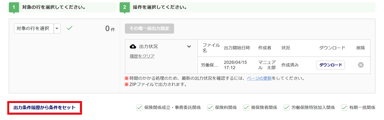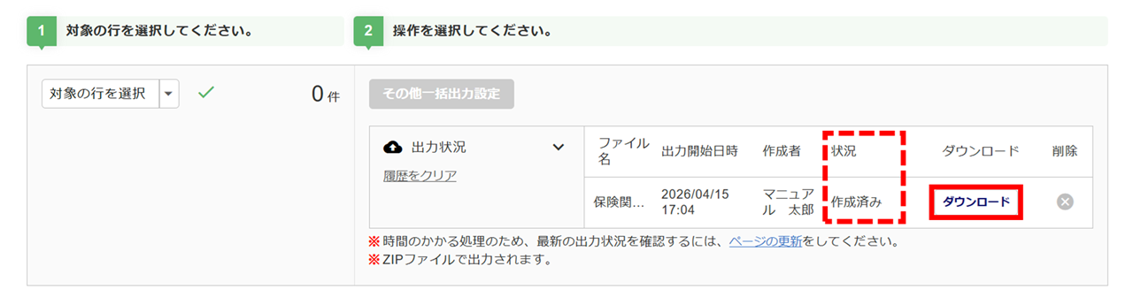 「出力状況」欄が表示され、「状況」が「作成済み」になるとダウンロードが可能となります。