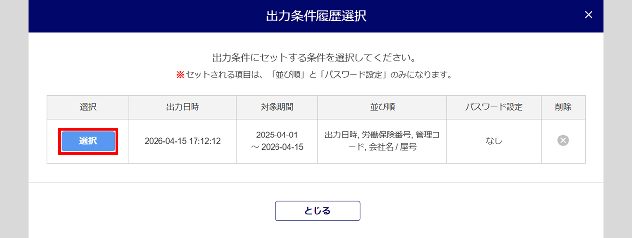 出力時に設定した内容(選択した帳票、並び順、ZIPファイルのパスワード設定)は、履歴として保存されます。