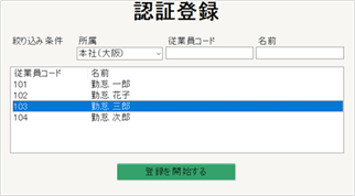 2.タイムレコーダーを起動し、[設定]>[認証登録]を選択します。 対象従業員を選択し、[登録を開始する]