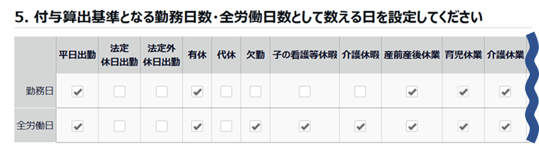 ホーム画面「設定」内[従業員]>[雇用区分設定]> 該当区分の[編集]>「休暇」カテゴリ >「有休付与」> [有休付与関連設定]>「5. 付与算出基準となる勤務日数・全労働日数として数える日を設定してください」