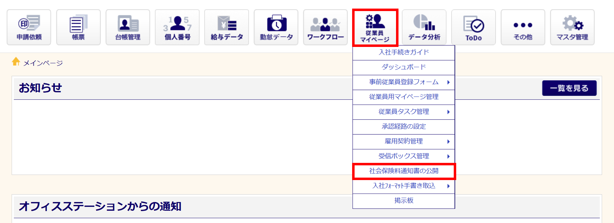 [従業員マイページ]>[社会保険料通知書の公開]をクリックします。